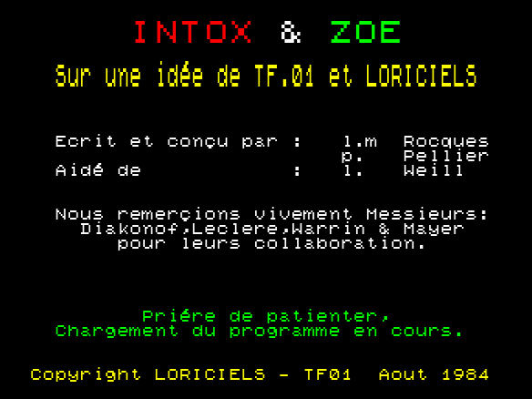 Une grande première pour ce Logiciel créé à la demande de TF01 pour sa série d'émissions. A chaque utilisation de ce jeu, une ville imaginaire va être construite, vous allez devoir aider nos deux héros à en sortir au plus vite. A chaque série de réponses et à la fin du jeu, vous serez récompensé par un super jeu d'Arcades. Le but du jeu d'Arcades est de diriger Zoé afin qu'elle atteigne tous les éléments constitutifs d'un micro-ordinateur, et qu'elle rejoigne Intox, en évitant las boules que celui-ci projette.