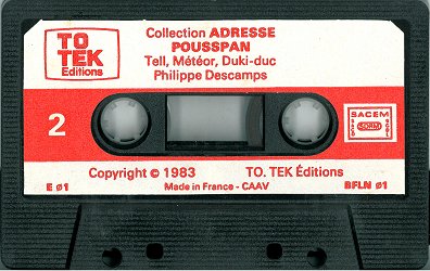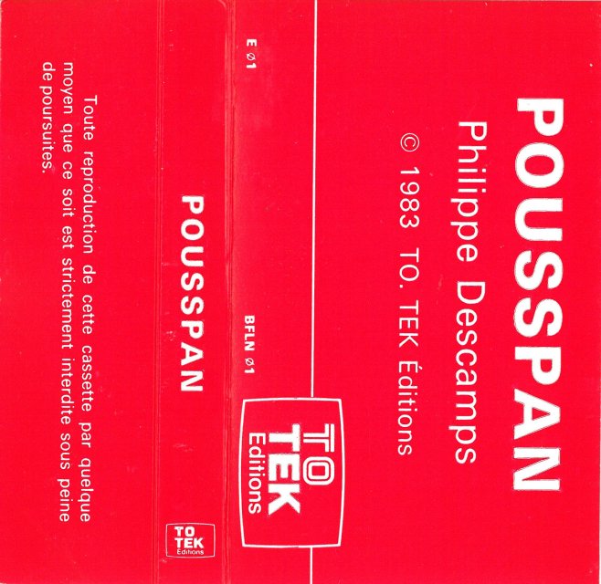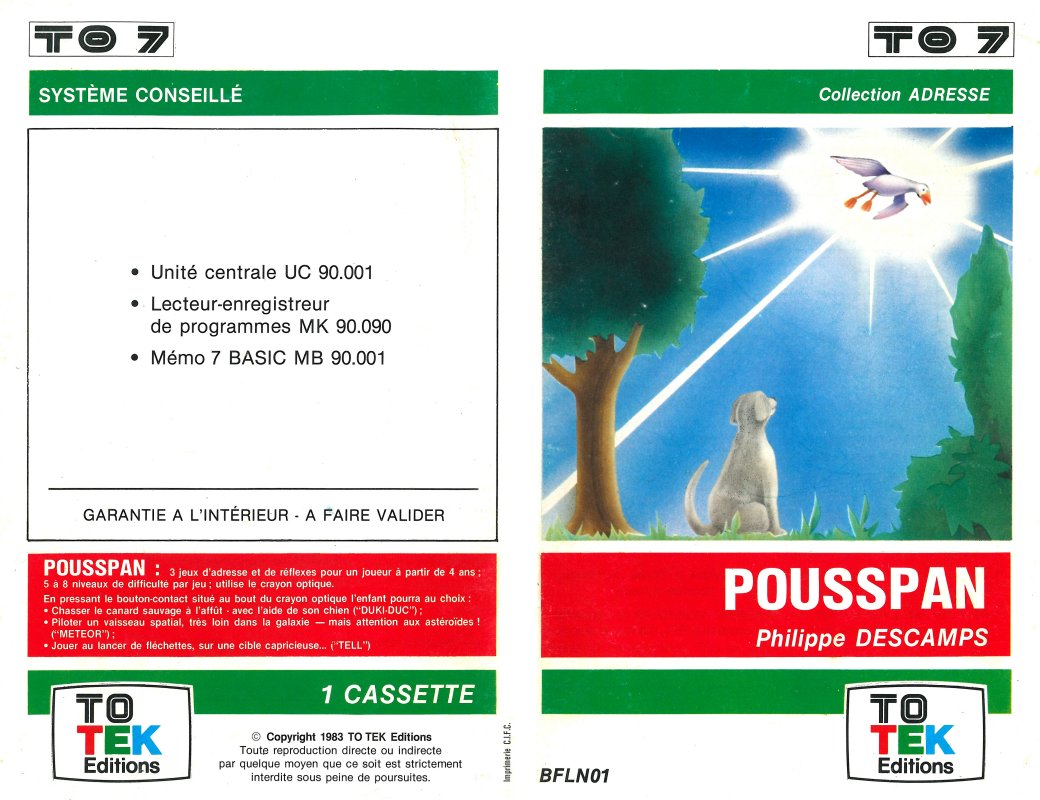 POUSSPAN est une cassette regroupant trois programmes de jeu. Leur simplicité d'utilisation les destine plus particulièrement aux enfants à partir de 4 ans. Chacun de ces jeux offre à l'enfant la possibilité de choisir entre plusieurs niveaux de difficulté, ce qui lui permettra d'améliorer ses performances de manière progressive. Les jeux proposés sont DUKI-DUC, METEOR et TELL.